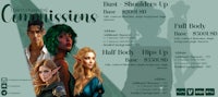 For couple portraits, group photos each additional character will cost 75% of the base cost. Detailed backgrounds will only be calculated from the base price. Depending on the posing of characters group portraits may be provided as standalone works as well as the group photo.